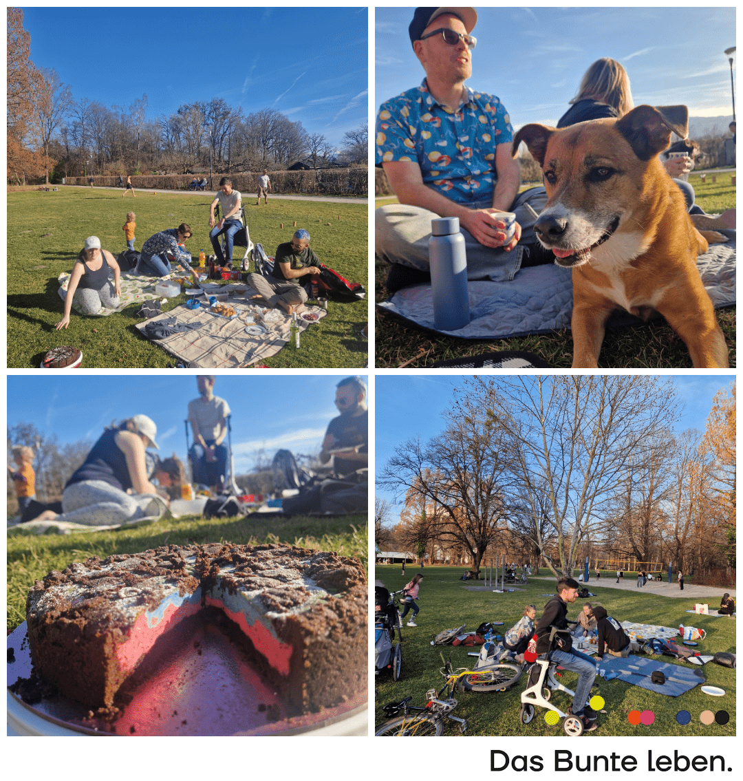 Bei strahlendem Sonnenschein haben wir spontan unser Kegeln abgesagt und uns für eine Outdoor-Aktivität entschieden. „Schade, wenn man so ein Wetter drinnen verbringt“, dachten wir und organisierten kurzerhand noch vor 8 Uhr morgens ein Picknick. Gut, dass wir von GÜ so spontan sind! Um 15 Uhr trafen wir uns im Donnenbergpark in Salzburg, direkt auf der Wiese beim Spielplatz. Jeder brachte etwas Gutes mit – von herzhaftem Nudelsalat und köstlicher Pizza bis hin zu Gugelhupf